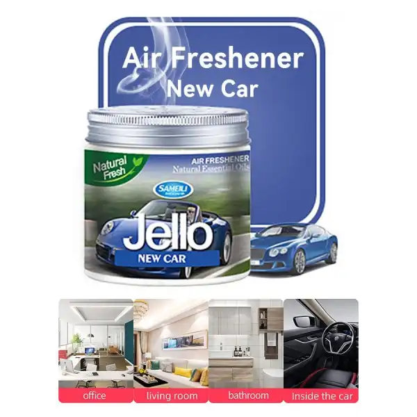 - This JELLO (New Car) gel air freshener perfume is perfect for car interiors, rooms, and offices and makes them smell great. This Jello gel (New Car) perfume eliminates odors and freshens the air, has a long-lasting fragrance and sweet smell that can remain for up to 30 days (temperature and airflow will affect duration and intensity).